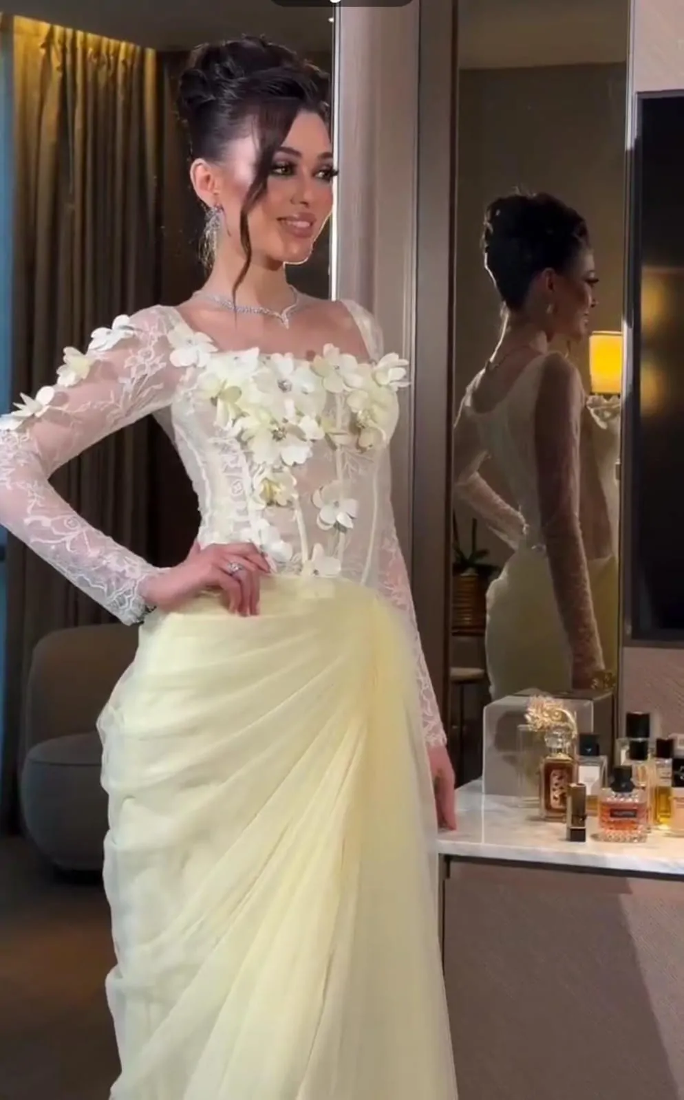 فستان سهرة استرتش ودانتيل مع ورود مطرزة